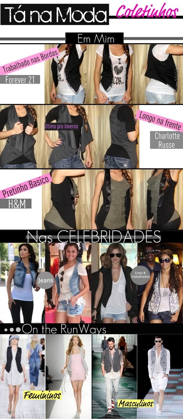 O Colete sempre foi uma peça clássica masculina, mas neste último ano entrou em alto estilo nas produções da mulherada! Eu sempre gostei dos coletinhos, é uma peça que pode mudar completamente um look. Dá pra usar com tudo, camisas, vestidinhos, short jeans, legings e saias.