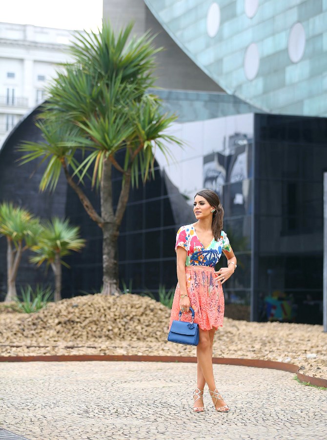 For the morning of the fourth day of SPFW, I started with a cheerful and super feminine look. I wore this long printed embroidered shirt, with a coral lace skirt on top which was sheer enough to show the print of the shirt. I loved this effect! I finalized the ensemble with gold sandals, a navy blue purse matching the print of shirt, and a messy ponytail. I love this hairstyle; it’s simple, fast and looks amazing!